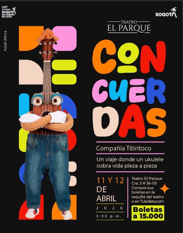 El Teatro El Parque presenta Concuerdas, una encantadora aventura musical para disfrutar en familia los días 11 y 12 de abril de 2026 a las 3:00 p.m., donde un ukelele cobra vida pieza a pieza y descubre, entre risas y tropiezos, que encontrar su propio sonido no será tarea sencilla. Cuando intenta sonar y lo hace mal, inicia un viaje lleno de humor y aprendizaje en el que unas notas traviesas lo invitan a escuchar y descubrir su verdadera musicalidad. De la mano de un director exigente, Uke y el público se sumergen en una experiencia participativa donde el error se transforma en oportunidad y cada intento hace parte del proceso creativo, hasta culminar en un concierto interactivo que celebra la música como juego, encuentro y expresión compartida, recordándonos que todos llevamos un sonido único por revelar.