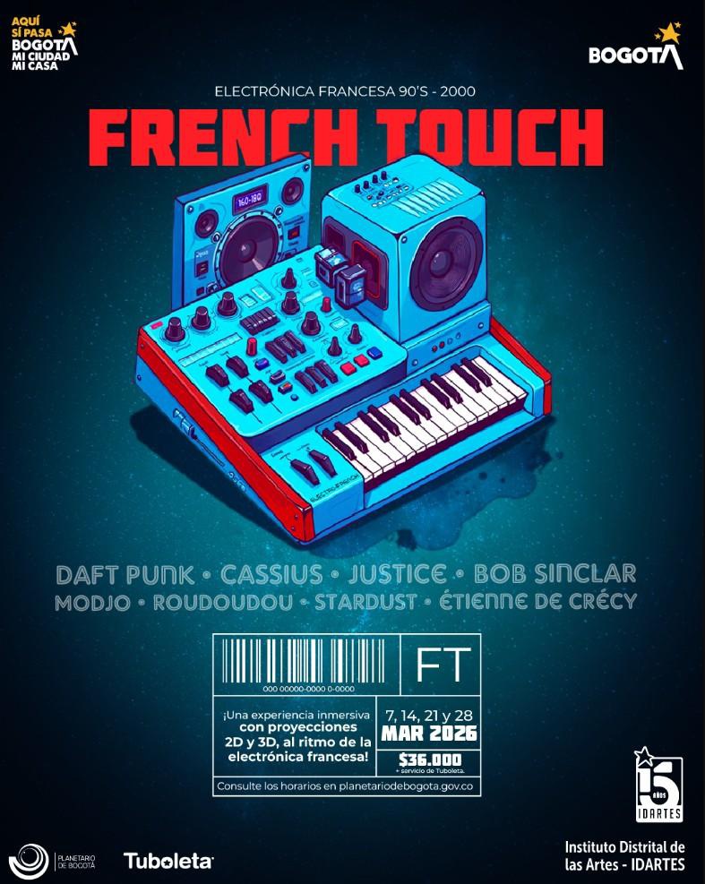Descripción: Un viaje electrónico que celebra la elegancia y el estilo de la música francesa. French Touch es una experiencia inmersiva que recorre los sonidos que revolucionaron la música electrónica en los años 90 y 2000, época en la que surgieron los beats sofisticados y las melodías hipnóticas que marcaron la cultura de las pistas de baile a nivel mundial. Bajo la cúpula del Planetario de Bogotá, ritmos envolventes y atmósferas minimalistas se fusionan con visuales en 360°, evocando la esencia vibrante de artistas que transformaron la escena electrónica global. Un homenaje visual y sonoro para quienes disfrutan de la electrónica con sello francés, donde la modernidad, la sensualidad y la innovación son protagonistas.