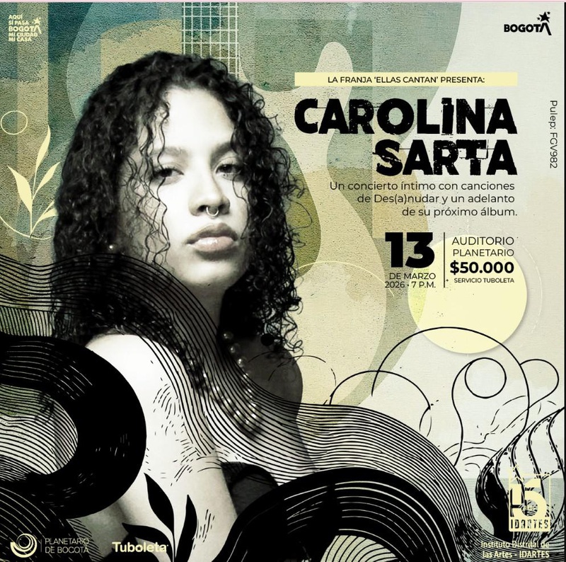 Descripción del evento:En el marco de la franja Ellas Cantan, Carolina Sarta presenta un concierto íntimo en el Auditorio del Planetario. Durante 50 minutos, la voz y la sensibilidad femenina protagonizan una experiencia musical que invita al encuentro con la creación contemporánea. Una oportunidad para disfrutar de un repertorio expresivo en un escenario excepcional. -